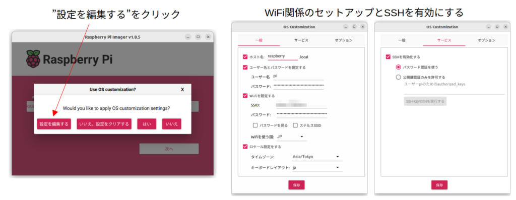 Raspberry Pi ImagerV1.8.5を使用してOSのイメージを作成します。